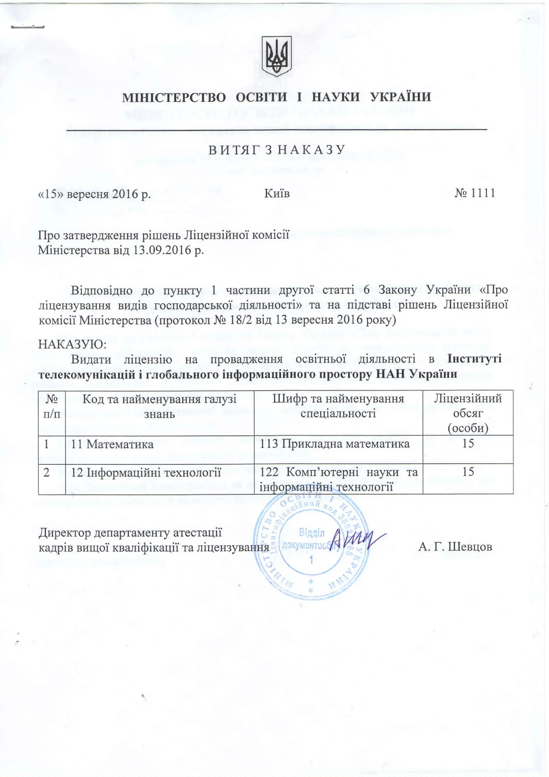 The Institute holds a license from the Ministry of Education and Science of Ukraine to provide educational activities at the third (educational and scientific) level of higher education in the following specialties: