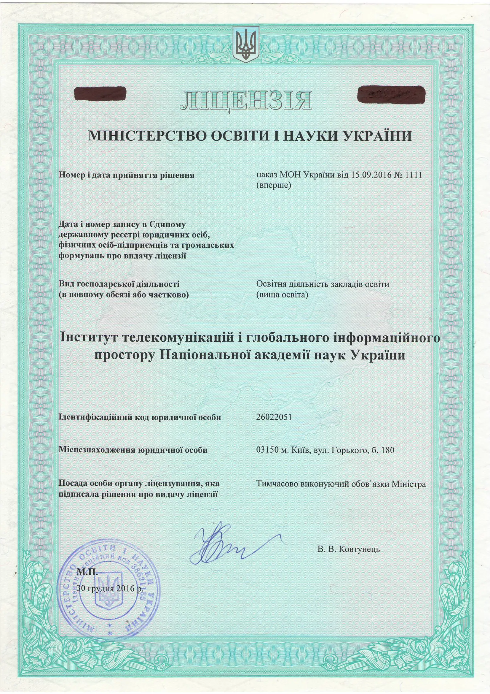 Інститут телекомунікацій і глобального інформаційного простору НАН України здійснює освітню діяльність на третьому (освітньо-науковому) рівні вищої освіти відповідно до чинного законодавства України. Усі освітні програми інституту пройшли необхідні процедури ліцензування та акредитації, що гарантує високу якість підготовки здобувачів наукових ступенів.